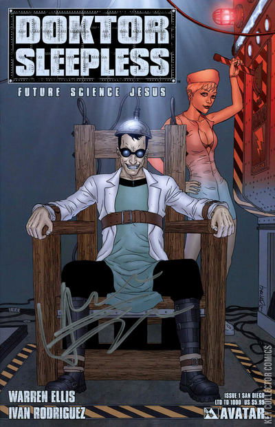 Warren Ellis is unleashed on this all-new, on-going, monthly sci-fi series! It's the near future. No-one has their flying car. Everyone feels cheated. What America needs now is a Mad Scientist. A city with a secret is shocked out of its apathy by the return of a young technological genius who has reinvented himself as Doktor Sleepless. But perhaps he never left and perhaps his planned new future doesn't include the city. For fans of Ellis' fantastic sci-fi tales and have missed the absence of Transmetropolitan, this series is what the Doktor ordered! The issue is available with a regular cover by series artist Ivan Rodriguez, or wraparound cover by Raulo Caceres, a signed poster edition which features a Doktor Sleepless poster signed by Warren Ellis himself, and also a rare 1-in-15 Future Warning Sign cover.
