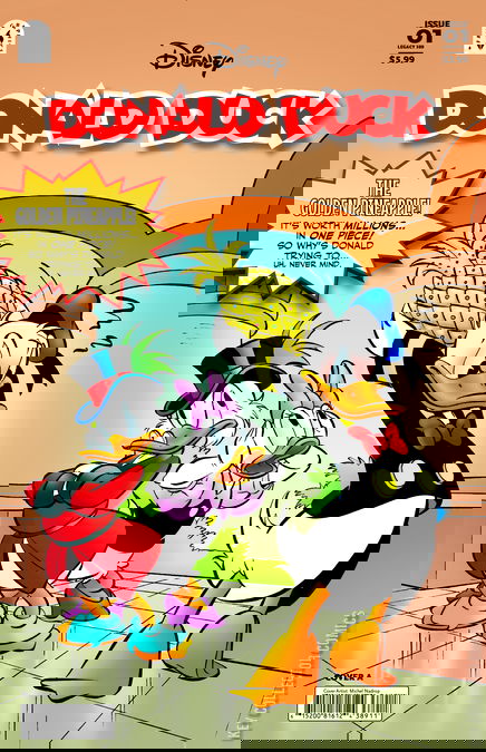 "The Golden Pineapple!" You can't buy this eye-poppin' giant fruit at a grocery store: it's 24 carats, it's worth billions - and it's been lost in distant Costa Pina for 750 years, despite 750,000 tourists' efforts to find it. Uh-oh, Uncle Scrooge hasn't found it yet, either... and in an epic adventure from fan-favorite artist Giorgio Cavazzano, Donald is fighting to get there first! Then in "Be Happy," jealous Donald always thought Gladstone Gander was Earth's luckiest duck... but a sadistic sea storm may prove otherwise!