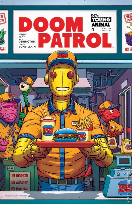 BRICK BY BRICK, PART FOUR: I'M SORRY I'M LATE Everything is getting stranger and stranger for Casey Brinke. The secrets she’s learned about her true origin do a little to explain the bizarre new surroundings she finds herself in, but not why she’s attracting the members of Doom Patrol like so many flies. Also, find out the secret ingredient that makes Danny Burgers so delicious! This issue features a variant cover by Paul Rentler that combines with this month’s other variant covers from DC’s Young Animal to form a single image.