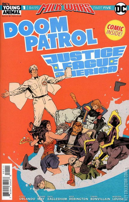 MILK WARS: THE END! As RetCo’s foundation shatters, the Young Animal teams come together with the Justice League and even more DC Universe heroes to finish the job. The only problem is, Milkman Man and RetCo still stand in their way. To right reality, the heroes of Young Animal and the DC Universe will have to unlock an outrageous power never before seen on any world!