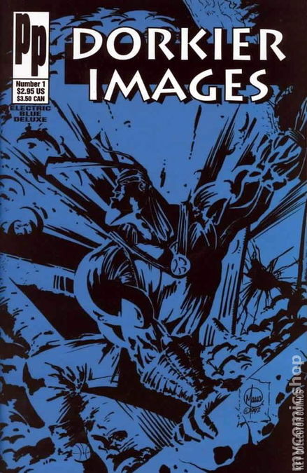 Gold Deluxe Edition cover by Bill Maus. Story and art by Bill Maus. Another superhero spoof by Parody Press, this one sending up Darker Image (1993) #1 and its trio of brooding superheroes: Bloodwolf, The Maxx, and Deathblow. Multiple other trends of mid-1990s comics are also targeted; like the comic it parodies, Dorkier Images has multiple cover variants, but no actual second issue was ever published.