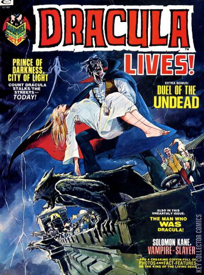 "Lord of Death... Lord of Hell!" - Dracula after having been turned into a vampire had gotten revenge against Turac the invading Turk who murdered his wife Maria. After burying his wife in the woods, the naked Dracula vows to get revenge against the whole world for the death of his wife. He then notices, far off in the sky, other vampires like himself approaching. Waiting to greet them, he is attacked and easily overpowered and the vampires carry him off into the night sky. Dracula revives to find himself before Nimrod the First, the king of the vampires. Nimrod orders Dracula to claim his loyalty to him, however, Dracula only threatens Nimrod's death. Nimrod accepts Dracula's challenge and tells him that the next day they will fight the Tournament of Stakes. "Shadow in the City of Light!" - Dracula is being shipped into France, and his arrival is anticipated by one Helene DuBois who is attempting to drive a stake into Dracula's heart. Unfortunately, she attempts to do so at dusk and Dracula awakens in enough time to stop her. Intrigued to know why this woman attempted to kill him, sensing a greater motivation, Dracula decides to spare her life so that he might learn the reason. "Castle of the Undead" - The Puritan adventurer Solomon Kane is searching for the lost Rosella Carson in Transylvania. He is attacked by bandits and is then saved from a pack of wolves by Count Dracula. Kane accepts the Count's invitation and recuperates in his castle. During the night, he is attacked by a mysterious girl, who turns out to be Rosella transformed into a vampire. Also includes: "The Vampire-Man", "I Was Once Born a Gentle Man", and "Fire Burn, Cauldron Bubble!"