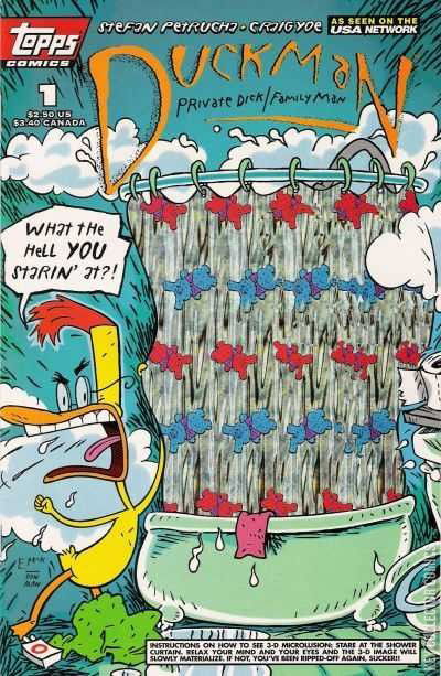 In this William S. Burroughs-like story, Duckman experiences a traumatic event that drives him temporarily insane. With the help of his family and his loyal partner, Cornfed Pig (not to mention his politically-correct stuffed animal secretaries, Fluffy and Uranus), Duckman is forced to remember the tragic events that drove him over the edge. What could have been so horrendous, so deplorable?! When you learn the chilling truth, you might just wish you hadn't! This debut issue features an extra-special cover enhancement: a special 3-D illusion cover created in the style of the hit Magic Eye books and Holusion posters. No glasses needed! Plus: a centerfold Duckman poster by creator Everett Peck.