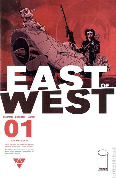 OUT OF THE WASTELAND The things that divide us are stronger than the things that unite us. A Sci-Fi Western set in a dystopian America where all hope for the future rests in the Four Horsemen of the Apocalypse... who just happen to be trying to kill the President of the United States. One of the most exciting new books of the year, this is EAST OF WEST, a brand new, ongoing, monthly comic from the award-winning team of Marvel's FF , JONATHAN HICKMAN and NICK DRAGOTTA.