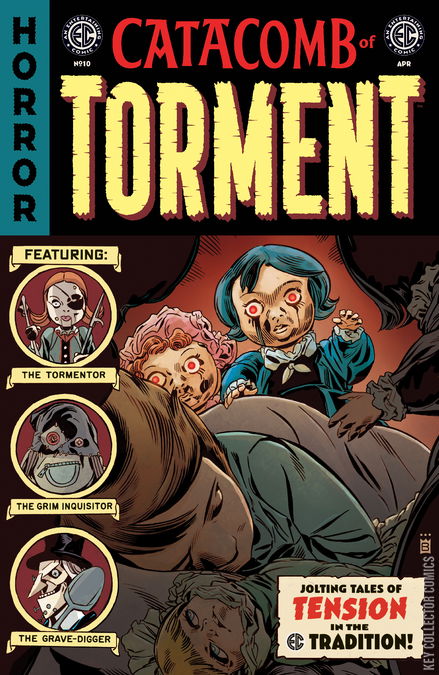 Welcome back to the Tormentor’s catacomb—it’s been torture waiting for you! This month, we proudly welcome a colorful (well, mostly red) cast of creators to spin yards of raw intestine into three putridly powerful tales of mayhem and malice in the malevolent EC Comics manner: Evan Dorkin (Beasts of Burden), J. Holtham (The Horizon Experiment), Lukas Ketner (Count Crowley), Brian Level (Poison Ivy), Andrea Sorrentino (Joker: Killer Smile), and more! Do you have the GUTS to withstand what’s coming next? Lay down on that cold slab and let’s find out! Don’t worry . . . this will hurt A LOT!
