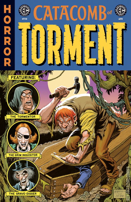 Welcome back to the Tormentor’s catacomb—it’s been torture waiting for you! This month, we proudly welcome a colorful (well, mostly red) cast of creators to spin yards of raw intestine into three putridly powerful tales of mayhem and malice in the malevolent EC Comics manner: Evan Dorkin (Beasts of Burden), J. Holtham (The Horizon Experiment), Lukas Ketner (Count Crowley), Brian Level (Poison Ivy), Andrea Sorrentino (Joker: Killer Smile), and more! Do you have the GUTS to withstand what’s coming next? Lay down on that cold slab and let’s find out! Don’t worry . . . this will hurt A LOT!