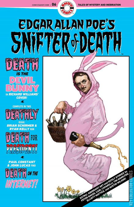 PUTTING THE "D" IN "DC" / SILENCE, A FABLE / HATE TO MEET YOU / 25 CENTS / THE PICTURE OF AMONTILLADO Last issue! Our anthology theme this month is, “Complaining and Whining About How Terribly Public Life is Going!” First, a demon drags Poe through the hellish nightmare landscape we call the Internet, in “Silence - A Fable.” THEN! The American people elect a new President—Death itself, in “Putting the D in DC.” All this plus prose, pix, and possibly, poems!