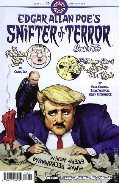 Season Finale! A ridiculous new take on the non-Poe classic 'The Strange Case of Dr. Jekyll and Mr. Hyde' written by Paul Cornell (Doctor Who). A so-disturbing-it's-funny tale from the margins of 'The Purloined Letter' by Carol Lay. An extra-long 'Poe and the Black Cat' petit guignol by Hunt Emerson! Plus, prose, pictures and, possibly, poems!
