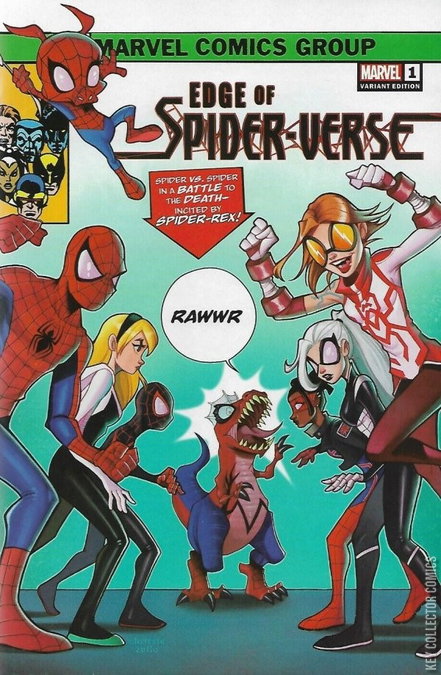 SOMETHING WICKED THIS WAY COMES / THE HERO WITHIN / SPIDER-REX!! / MY DAME... MY DESTINY THE END OF THE SPIDER-VERSE IS COMING! edge (’ej) noun – 1. outermost limit of an object. – 2. the sharp side of a blade. The leading edge of the Spider-Verse brought you Spider-Gwen and Peni Parker. This final edge will introduce you to some of the most important characters in the future of the Spider-Verse…but it will also slice the final strand of the web. IN THIS ISSUE: SPIDER-MAN NOIR! ARAÑA’S NEW STATUS QUO! SPIDER-REX AND MORE!