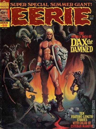 Dax The DamnedDax, the warrior who walks among gods rescues a beautiful woman from the cave of death, and leases a deadly plague on all mankind!The Paradise TreeDax is ensnared by a guardian tree that leads to the bowels of earth itself! There, he meets a monster who wants the barbarian as a mate!ChessThe warrior is pulled into the heavens to meet the gods in a game of chess. The pawns: members of Dax' own family. The precious prize to be won: their very lives!Let the Evil One Sleep"He created me," she explained. "The evil one who sleeps in the forest! With but a thought, he can destroy us and the world about us!"The Golden LakeThe mighty Dax is trapped on an island of beautiful women. An island paradise of gold, jewels and riches beyond imagination. an island of devils!The With, The ManeaterA troll leaps from the darkness to attack Dax and his mercenaries. Dax wakes to find a witch cooking and eating his warriors.The CyclopsAn enormous monster captures and abuses a defenseless maiden. to her rescue rushes Dax. alone against the vicious giant and his one-eyed brothers.StarlightAnother endangered lass is brought from death's grasp by the warrior hero. But in so doing, Dax angers her prehistoric monster captors, who go off in pursuit!The Lord's PrayerDrawn to a demon-shaped temple, Dax discovers all manner of carnage. But he can only watch as sorceress offers up a living human sacrifice!Death Rides This NightHere is the moment of Truth! Dax faces death and his dark angel! Incredibly, Dax meets the pair in combat, with a surprise ending!