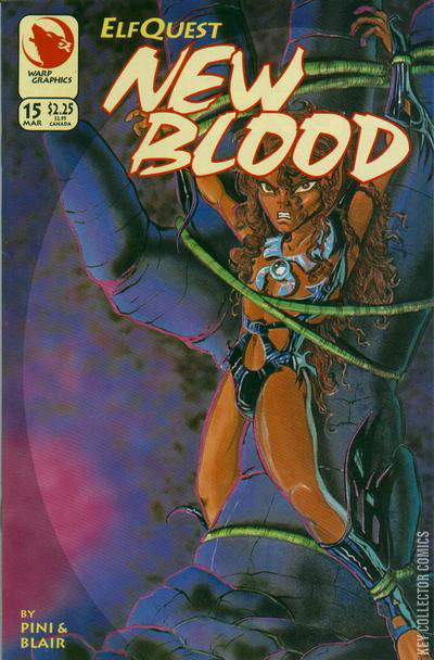 Cover art by Barry Blair. Forevergreen [part 3], script by Barry Blair and Wendy Pini, art by Barry Blair; Humans approach Sorrow's End; Windkin is captured by humans who mutilate themselves to be like Elves on another continent; Dart mounts a rescue expedition. Cover and Promo For New Blood #16. 36 pgs. $2.25. Cover price $2.25
