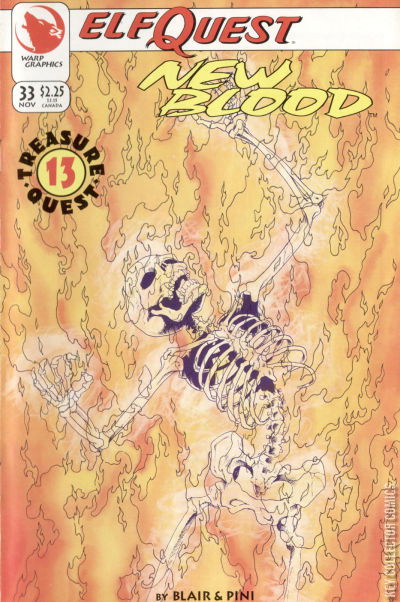 Treasure Quest, part 13. Cover art by Steve Blevins. Blood's End Part One, script by Barry Blair and Richard Pini, art by Barry Blair; Doors reign continues its dark growth while the elves seem thwarted at all sides. Promo for New Blood #34, art by Barry Blair. 36 pgs. $2.25. Cover price $2.25.