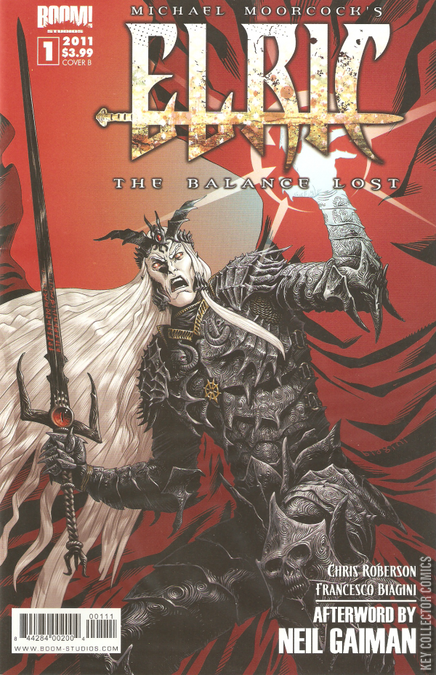For 40 years comic fandom has thrilled to the exploits of Elric since his introduction in Marvel Comics' Conan the Barbarian in the early 1970s. Neil Gaiman called Elric's creator Michael Moorcock 'my model for what a writer was' while Warren Ellis said he is one of the 'eight core sites in my creative genome.' Now the godfather of the Multiverse teams up with hot New York Times bestseller Chris Roberson (Superman, iZombie, Stan Lee's Starborn) for an ongoing series that sees a crisis break out across multiple worlds with Moorcock's other two most famous fantasy franchise characters, Corum of the Scarlet Robe and Dorian Hawkmoon! The workings of Fate are being tampered across the Multiverse, upsetting the Cosmic Balance. Elric is on a quest to restore The Balance and save the Multiverse from ruin! Elric, Corum, and Hawkmoon are forced into action far and wide, but will they fight on the side of Law... or...