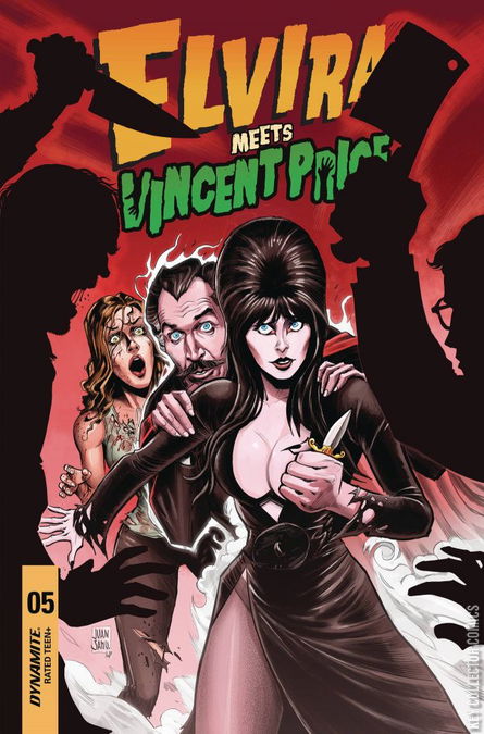 A famous "scream queen" actress is missing, and Elvira and Vincent Price join forces again to find her... even if it means literally breaking the fourth wall, and entering the world of a slasher movie. Can the Mistress of the Dark save the Final Girl before a sadistic director traps her forever in a digital nightmare? Meta-thrills, chills and bad puns from writer David Avallone (Bettie Page, Drawing Blood) and Juan Samu! And the mistress of the dark has never looked better under this busty bevy of covers: Acosta! Samu! Marques/Bone and a photo of the lady herself!