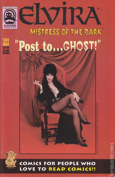 Cover Photo by David Goldner. Stories by Richard Howell and Frank Strom. Pencils by Dan Day and Chuck Frazier. Elvira guests on one of those "talk to the dead" syndicated shows, but something may be awry in the avenue to the afterlife in "Post to... Ghost!" Also, the evil Countess Trollez leads Elvira on an international chase in "After a Fashion: Part 2"!