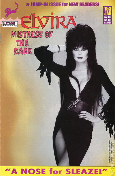 Cover Photo by David Goldner. Stories by Frank Strom and Janet Hetherington. Art by Eduardo Barreto, Ronn Sutton, Terry Austin and Bill Anderson. In this year's new-reader-friendly jump-in issue, Elvira's career at station K-WHA? is recounted, as a tabloid reporter ferrets out a sordid secret, in "A Nose for Sleaze!" Also, demons disrupt Elvira's appearance at Trick Dark's New Year's Eve Blast in "This is Vinyl Crap: Part 2"!