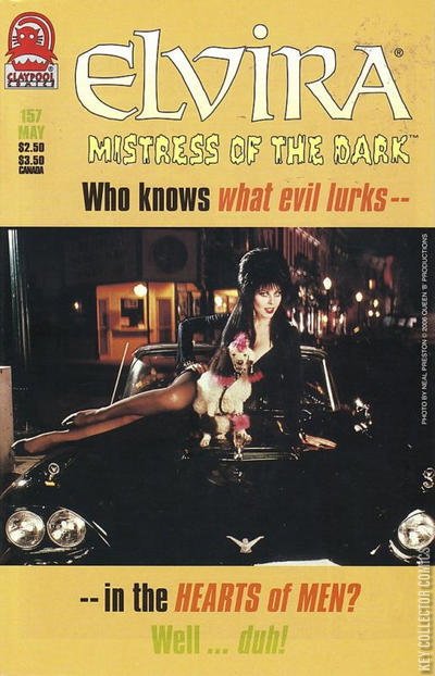Cover Photo by Neal Preston. Stories by Frank Strom and Janet Hetherington. Art by Ronn Sutton, Dan Day, Joe Rubinstein and Al Milgrom. Elvira's gumball machine prize turns out to be an object of vast mystic power, and the only thing standing between her and a frenzied cult is the mysterious pulp hero The Visage, in "The Visage of Bitter Fruit!" Also, a charity event turns accursed with "The Monster of Sureweed Forest!"