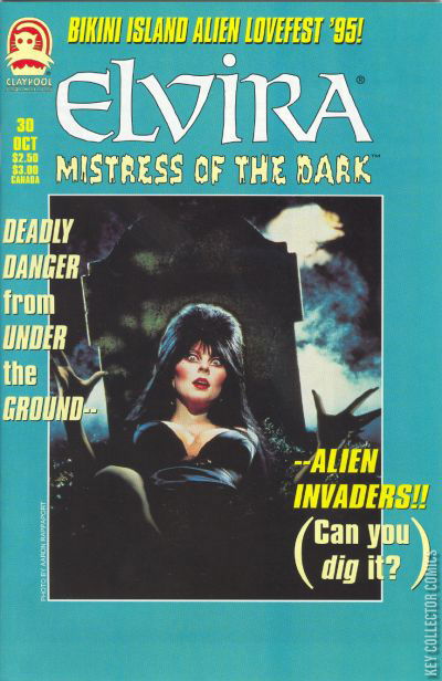 In "Bikini Island Alien Lovefest '95," by Frank Strom and Tom Simonton, Elvira takes part in the annual swimsuit issue photo shoot for a famous illustrated sports magazine on a famous island. What will happen though, when giant heads on the island come to life and announce their plans to take over the Earth? Also, Elvira has a problem with ghosts in her lovelife in "Summer Days, Withering Wights," by Richard Howell and Jim Webb.