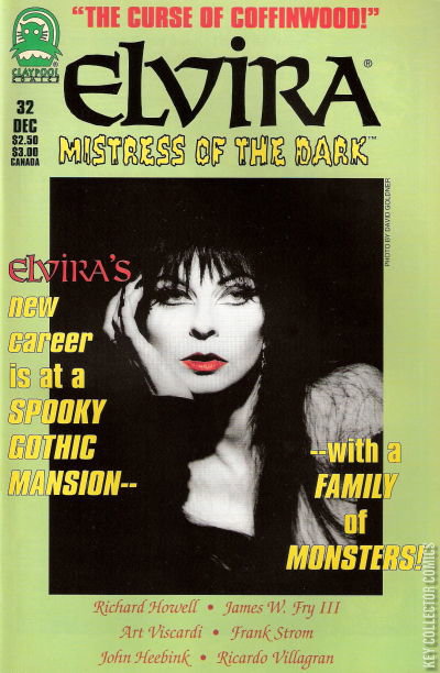 Elvira's new job puts her in the position of nanny to a murderous child of a rich family. Can she fend off his evil attentions while finding the connection between him and a classic horror soap opera from the sixties? "The Curse of Coffinwood!" is by Richard Howell, James W. Fry III and Art Viscardi. Plus, "The Perils of Elvira" Part One, by Frank Strom, John Heebink and Ricardo Villagran.