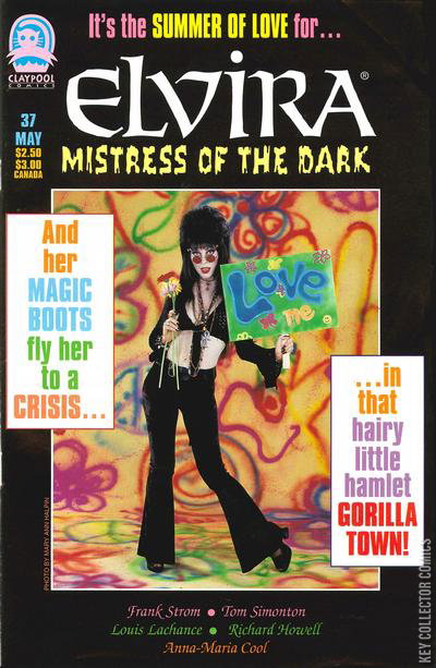Elvira's most critical adventure yet, as she heads to the secret settlement of Gorilla Town, just in time to become the target of its most deadly danger, Pete Primate! "Crisis in Gorilla Town" is by Frank Strom, Tom Simonton and Louis Lachance. The back-up concludes the story of Elvira's station manager's nice twin, and the evil plan that created her! By Richard Howell and Anna-Maria Cool. B&W,
