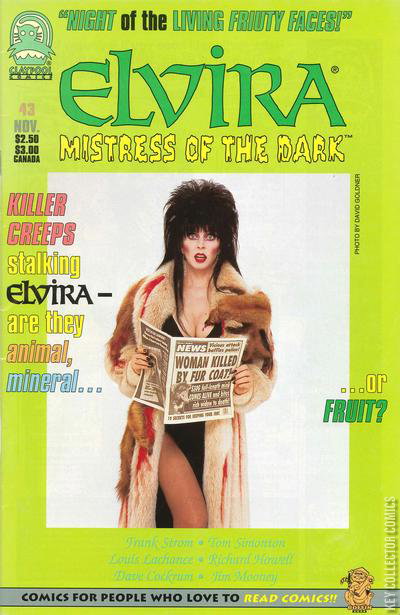Elvira finds more than she bargained for at a vintage toy show as the Fruity Faces--her childhood drink-mix friends--come to life and terrify the countryside! By Frank Strom, Tom Simonton, Louis Lachance, Richard Howell, Dave Cockrum and Jim Mooney.