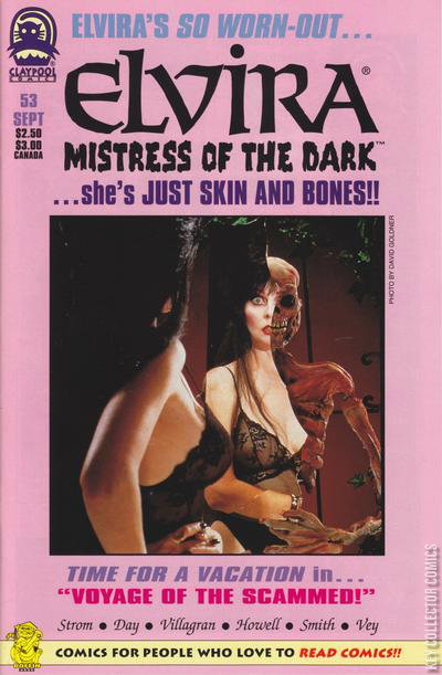 Elvira's digging her down-time on a cut-rate sea cruise, until she discovers that the ship is full of buffet-minded werewolves. The only thing that could make things worse would be the attack of a giant cyborg squid-monster...then that happens, too! It's all in "Voyage of the Scammed." Plus, Elvira applies her considerable resources to track down the villain who's trying to ruin her best friend's band of street performers in the climax of "All's Fair." By Frank Strom, Dan Day, Ricardo Villagran, Richard Howell, Tod Smith and Al Vey.