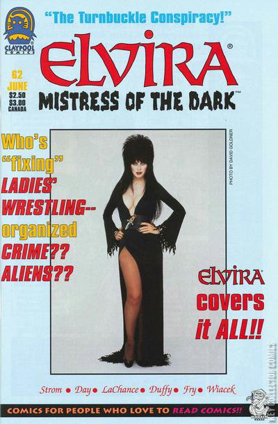 The pressing question of the day: Who's fixing Ladies' Pro Wrestling? Could it be mobsters? Aliens? Is there an option #3? Elvira's determined to find out, and that means strangeness, cheesecake, and lots of laughs! Also, in Part Three of "Historical Babes," Elvira's search for the missing necklace is aided and abetted by Earnest Blank from the Minutiae Group and Maxine Scarlet, the Profile Maker! By Frank Strom, Dan Day, Louis Lachance, Jo Duffy, James W. Fry III and Bob Wiacek. B&W, 32 pg. Cover price $2.50.