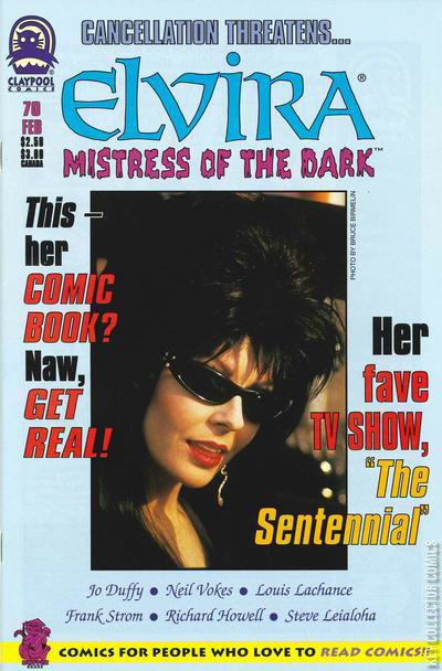 No amount of supernatural chaos could ever have prepared Elvira for the surging menace known as prime-time TV programming! Once her favorite show is cancelled, she's willing to take on any number of demons and devils to rescue it. It's all in "The Sentennial!" Also, Spooky Suzie tries to strong-arm the Elvira creative staff into making her the book's heroine in "Brainstorming Session." By Jo Duffy, Neil Vokes, Louis Lachance, Frank Strom, Richard Howell and Steve Leialoha.