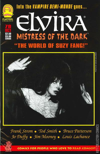 When Elvira meets SHAYDE, the Vampire Slayer, her social horizons are expanded in a bad way, as she is dragged along on his quest to rid the world of vampire night-clubbers, led by the sultry Suzy Fang. It's all in "The World of Suzy Fang!" Also, Elvira investigates a haunted racetrack in "Jockeying for Possession." By Frank Strom, Tod Smith, Bruce Patterson, Jo Duffy, Jim Mooney and Louis Lachance.