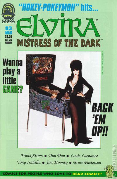 Elvira's down with the newest entertainment craze: those little collectible critters from across the seas. But what about the cosmic-level one of those cute pocket monsters, and the evil entity who wants to use its power to rule our universe? It's all in "Hokey-Pokeymon!" Also, Elvira's community service job brings her into conflict with some book-burning zealots in part one of the latest three-part tale, "Better Read Than Dead." By Frank Strom, Dan Day, Louis Lachance, Tony Isabella, Jim Mooney and Bruce Patterson. B&W Cover price $2.50.