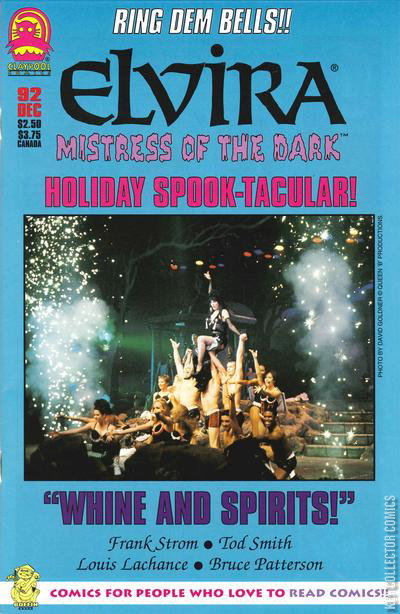 Elvira's forced into the middle of a deadly domestic clash, as Santa Claus' evil first wife hijacks the holiday, forces the elves out on strike, and even tries to eliminate the Mistress of the Dark. It's got elves, giant nuclear ants, vikings and reindeer--and it's all in this year's annual book-length yuletide yuk-fest, "Whine and Spirits!" By Frank Strom, Tod Smith, Louis Lachance and Bruce Patterson. B&W Cover price $2.50.