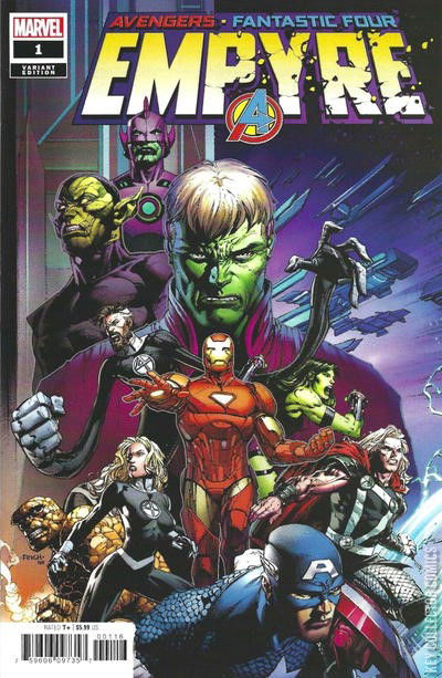 PART ONE Continued from Empyre: Avengers #0 and Empyre: Fantastic Four #0 The Kree and the Skrulls have united under a new emperor—and their war fleet is on a collision course for our world. On the moon, the Avengers are ready to strike with the full power of Earth’s Mightiest Heroes. Approaching from outer space, the Fantastic Four are seeking a diplomatic solution. If the two teams can’t work together to save the day, things can only get worse...