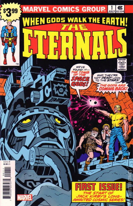 " The Day of the Gods " The First Appearance of the Eternals! King Kirby's very own cosmic series starts here! Deep in the God Chamber, archeologist Daniel Damien and his daughter Margot learn from their assistant, Ike Harris (a.k.a. Ikaris the Eternal) that he must activate the Cosmic Beacon deep within the God Chamber! But Deviants Kro and Brother Tode have another plan for Ikaris in mind...
