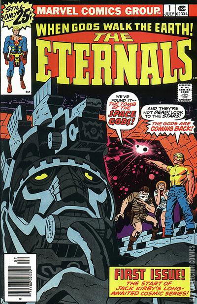 " The Day of the Gods " The First Appearance of the Eternals! King Kirby's very own cosmic series starts here! Deep in the God Chamber, archeologist Daniel Damien and his daughter Margot learn from their assistant, Ike Harris (a.k.a. Ikaris the Eternal) that he must activate the Cosmic Beacon deep within the God Chamber! But Deviants Kro and Brother Tode have another plan for Ikaris in mind...