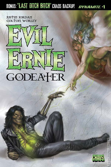 Something bad is coming. Something that could kill Heaven and Hell and the Earth itself: The Godeater. And the only thing standing its way is... Evil Ernie? We're probably all screwed. Dynamite Entertainment proudly welcomes Justin Jordan, the Harvey Award-winning writer of such horror hits as The Strange Talent of Luther Strode and Shadowman, as he debuts the all-new 'Godeater' storyline, an event so epic in scope, it promises to shake the very foundations of the Chaos! universe! EVIL ERNIE #1 comes jam-packed with additional content! As if one potential doomsday wasn't enough, Dynamite delves into the Chaos mythology in 'Last Ditch Bitch,' a serialized back-up feature that introduces Liv Halvorsen, lead singer of a Scandinavian Death Metal band... and an unwitting pawn in Ragnarok! Plus, this issue will include an in-depth interview with Justin Jordan about Evil Ernie, the Chaos! Comics universe, and more!
