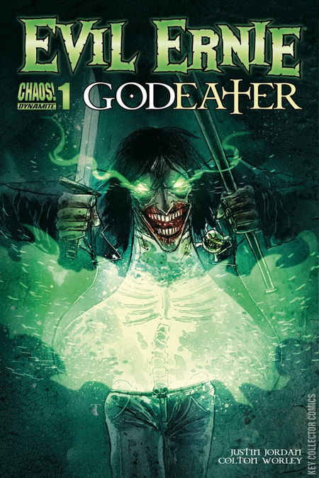 Something bad is coming. Something that could kill Heaven and Hell and the Earth itself: The Godeater. And the only thing standing its way is... Evil Ernie? We're probably all screwed. Dynamite Entertainment proudly welcomes Justin Jordan, the Harvey Award-winning writer of such horror hits as The Strange Talent of Luther Strode and Shadowman, as he debuts the all-new 'Godeater' storyline, an event so epic in scope, it promises to shake the very foundations of the Chaos! universe! EVIL ERNIE #1 comes jam-packed with additional content! As if one potential doomsday wasn't enough, Dynamite delves into the Chaos mythology in 'Last Ditch Bitch,' a serialized back-up feature that introduces Liv Halvorsen, lead singer of a Scandinavian Death Metal band... and an unwitting pawn in Ragnarok! Plus, this issue will include an in-depth interview with Justin Jordan about Evil Ernie, the Chaos! Comics universe, and more!