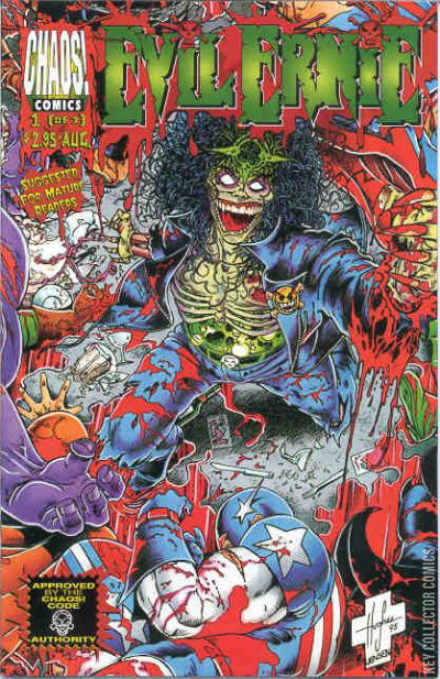 Evil Ernie takes a break from his day-to-day war on humanity in favor of slaughtering generic superheroes with ease in the most brutal ways possible. These light hearted and tongue in cheek issues explore what it would be like if Ernie was faced with a foe that had some hope of matching his undead powers. In this issue Ernie throttles American Man with his own intestines, splats the mighty molecule, mashes Spider captain,exterminates the Exterminator, crashes Bat Ranger &Blue Jay and explodes the G-Men. All because his superhero parents abused him for having no powers of his own while superheros ignored the bruises. Or is it all in the mind of a nightmare twisted Dr Price recovering from the loss of his arms to Ernie.
