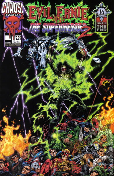 Evil Ernie takes a break from his day-to-day war on humanity in favor of slaughtering generic superheroes with ease in the most brutal ways possible. These light hearted and tongue in cheek issues explore what it would be like if Ernie was faced with a foe that had some hope of matching his undead powers. In this issue Ernie gets beamed by mistake onto a super hero space station where he causes bloody havoc on the heroes inside.
