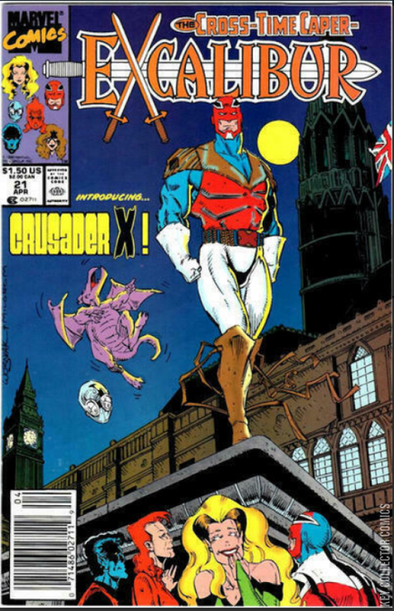 The Cross-Time Caper: Part 9 of 12 - "Crusader X!" Story continued from Excalibur #19. Enter a world where the Shadow Kings evil reigns supreme and Iron Man is a villain?! Plus, who is Crusader X? NOTE: This cover is an homage to the cover of Excalibur (1988 1st Series) #1.