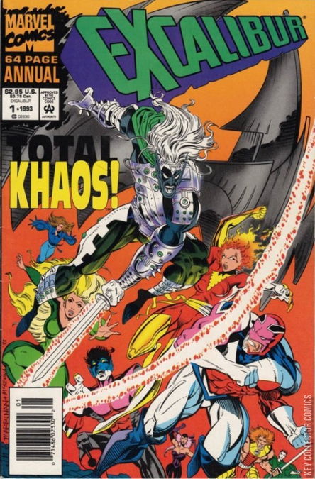 1st story: "Black Magic" A dark elf plagues Cerise’s dreams. With Excalibur, she traces the source of her dreams to a nearby castle, occupied by an elderly magician named Ghath. He blames the dreams on his attempts to return to his true world and apologizes. Suddenly, the dark elf Khaos breaks in and attacks. After taking him captive, Cerise realizes that Ghath is the true enemy; a sorcerer who’s still causing destruction on his homeworld of Irth. Excalibur and Khaos follow her to Ghath’s castle, where they’re magically transported to Irth. They defeat Ghath, only to discover after returning home that remnants of Ghath’s spell have trapped Khaos on Earth. He declines Excalibur’s offer to join and focuses on discovering a way home. 2nd story: "Honey Is Money": Technet's own short story. A knight serving the Princess Flavia holds Numbers hostage, forcing the Technet to retrieve special nectar from another dimension. After narrowly escaping from giant bees, Technet returns with the bounty. Flavia appears and takes the nectar, using it to cure the knight’s acne. Format Annual Page Count 64 pages Cover Price $2.95