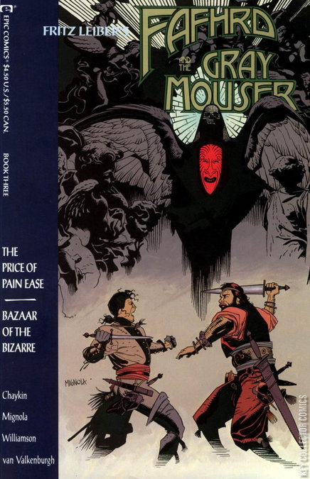 48-page squarebound giant (no ads). Cardstock cover, art by Mike Mignola. The Price of Pain Ease, script by Fritz Leiber (original story) and Howard Chaykin (adaptation), pencils by Mike Mignola, inks by Al Williamson; The promise of release from the haunting spectre of their lost loves drives Fafhrd and the Gray Mouser to the foreboding world of Shadowland, the Home of Death; The vast emptiness of Death's parlor is the testing ground of their loyalty and friendship. Bazaar of the Bizarre, script by Fritz Leiber (original story) and Howard Chaykin (adaptation), pencils by Mike Mignola, inks by Al Williamson; Friend risks life for friend as Fafhrd and Mouser adventure in this tale of dark sorcery and witchcraft. Based on Fritz Leiber's characters.