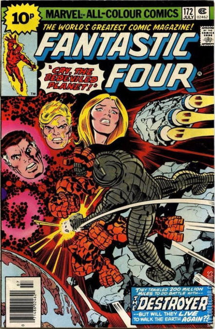 CRY, THE BEDEVILED PLANET! Following their battle against a golden gorilla that grew to gigantic size, the Fantastic Four are surprised that once restored to its original height and taken into their custody it can talk. Introducing itself as Gorr, it explains to the FF that it has come from a distant world to seek out the Fantastic Four's help in stopping Galactus. When the Fantastic Four deliberating the situation, Gorr finds that time is running out and breaks free from his bonds. This incites another battle with the Fantastic Four, but this time with his full intelligence and his natural size restore the golden ape known as Gorr easily batters the Fantastic Four and escapes in their Fantasti-Car. Chasing after the intelligent ape in their original Fantasticar, the Fantastic Four find that Gorr has return to his ship. Entering it, they soon realize that the whole battle was an attempt to trick the Four into entering his ship so that he could bring them to his world. While travelling through space, Gorr reveals that he comes from Counter-Earth, a world created by the High Evolutionary, a world that was tainted by the evil Man-Beast until he was defeated by the combined efforts of Adam Warlock and the Hulk. He explains that recently Counter-Earth had been discovered by the new Herald of Galactus, the Asgardian Destroyer armor. With Galactus posing a threat to his world, the High Evolutionary sped up Gorr's evolution turning him into a New-Man and sending him to Earth to recruit the Fantastic Four, the only beings that the Evolutionary knew to have defeated Galactus on more than one occasion. Arriving just out of Counter-Earth's orbit, Gorr and the Fantastic Four arrive to see that the Destroyer is attempting to approach the High Evolutionary's artificial asteroid base. Despite the High Evolutionary's mental powers trying to keep the Herald at bay, he fails to stop the sentient armour from landing on his base. With no time to lose the FF begin putting on space suits, but they send out Ben first since his exo-suit maintains a temporary atmosphere and send him out to battle the Destroyer. Ben clashes with the Destroyer and at first it seems as though the Destroyer is actually going to defeat him in combat when Ben is suddenly able to seemingly defeat the creature. Before he can celebrate, he is telepathically alerted by Galactus that in order to continue his existence he must feed and as such Counter-Earth must die.