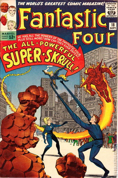 A SKRULL WALKS AMONG US! After watching the news coverage of their battle against Doctor Doom, Reed and Sue prepare to go on a test run to the Hawaiian islands in the new experimental passenger I.C.B.M. device. While they are gone the Torch and the Thing go on separate dates. Meanwhile, in the fifth quadrant of the Andromeda galaxy, the emperor of the Skrulls has finalized his plans to destroy the Fantastic Four after his people's last failed attempt to invade the Earth. This time the Skrulls have created a new warrior called the Super-Skrull who can mimic all of the abilities of the Fantastic Four but is far more powerful than his foes. After demonstrating his powers, the Super-Skrull is given orders to conquer the Earth. A week later, the Fantastic Four are out shopping when they hear radio reports that an alien being had landed in Times Square. They arrive just as the Super-Skrull had declared the Earth as belonging to the Skrulls and planting the Skrull flag. When a mob of people confronts the alien, the Super-Skrull easily bats them aside. When the group tries to battle the Super-Skrull, they find that they are no match for his superior abilities, especially when he combines them and uses his naturally born Skrull shape-shifting powers. When the Fantastic Four are forced to flee the scene, the Super-Skrull allows them to leave, planning on going after them later. Back in his lab, Reed begins investigating the source of the Super-Skrull's power as they are not natural. He soon deduces that the energies needed to power him are beamed from the Skrull homeworld. With this knowledge, Reed constructs a device that will jam the Super-Skrull's powers. The FF then goad the Skrull into meeting them on a deserted island for their final battle. There, the Fantastic Four keep the Super-Skrull occupied while the Invisible Girl plants the jamming device on their foe. The device works as planned, blocking the energies needed to power the Super-Skrull. Without his powers, the Skrull is knocked into a crater on the island and is trapped below by the Torch who uses his powers to fuse sand over the opening.