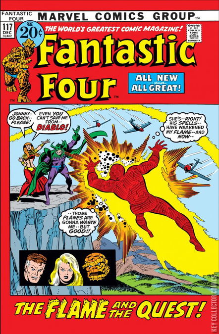 THE FLAME AND THE QUEST! The Human Torch has decided to reunite with his girlfriend Crystal and has flown to the Great Refuge of the Inhumans to find her. As he flies there, he recalls how she was forced to return home in order to protect herself from the pollution of the city. As he approaches the home of the Inhumans, the Torch is suddenly attacked by a trio of Inhumans seeking to prevent him from entering the kingdom. Fighting back, Johnny soon learns that the kingdom of the Inhumans is once again back under the control of Maximus the Mad and that Crystal has not been seen in these parts since she last left it with the Fantastic Four. Uninterested in the current political climate of Attilan, the Torch leaves to continue his search for Crystal elsewhere. Meanwhile, in Whisper Hill, Agatha Harkness is entertaining Reed, Sue, Ben, and Alicia Masters. As Ben and Alicia take a tour of the mansion, Ben is frightened when he almost trips over Agatha's cat Ebony. Suddenly, Ben is called outside where he sees that the Torch has arrived and that after an exhausting trip back to the United States, has passed out and is falling from the sky. Reed and Ben quickly grab Johnny and save him from a fatal fall. Recovering enough to get to his feet, Johnny goes to see Agatha to petition her to use her magic to try and find out what happened to Crystal after she left the company of the Fantastic Four. While Agatha manages to summon an image of Crystal and Lockjaw from her crystal ball, the image is brief and quickly vanishes before it can reveal anything to Johnny. Agatha tells Johnny that Crystal's whereabouts are beyond her ability to detect, and she leaves Johnny to mourn over his lost love. What they didn't know is that, after she left the Fantastic Four, Crystal was teleported by Lockjaw to a distant future where humanity had long ago wiped itself out in a great war. There they were knocked out by the alchemist known as Diablo, who has been trapped in the distant future following a failed alliance with Doctor Doom. That evening at Whisper Hill, Johnny cannot sleep and finds himself pacing the house. He is suddenly drawn to Agatha's crystal ball which begins showing him images of Crystal at an ancient Mayan pyramid wearing strange garb and standing beside Lockjaw and Diablo. Johnny rushes out and flies off to rescue her, waking up Ben as he departs. In the nation of Terra Verde, Diablo has led the oppressed people to believe that Crystal is the Mayan god known as Ixchel, using his alchemical powers to restore their ancient temple and enslaving her. After Crystal uses her elemental powers to "prove" Diablo's claims, the people agree to join forces with him and rise up against General Robles, who rules over them with an iron fist. With the people disbursed, Diablo retreats into the temple where he gloats over cowing the locals in the hopes of taking control of Terra Verde and using its rich supply of alchemical minerals to found his own rival nation against Doctor Doom. Needing to constantly apply the same drug to keep Crystal under his control, he orders her to drink another dose. Meanwhile, at the royal palace of Terra Verde, General Robles is informed about the arrival of Diablo and the woman claiming to be Ixchel. With the people heading towards his palace, Robles orders the air force to be deployed to crush the uprising. As the fighter planes begin bombing the dissidents, the Human Torch arrives over the horizon. Dismissing the attack as nothing more than war games, the Torch continues on his path to find and rescue Crystal.