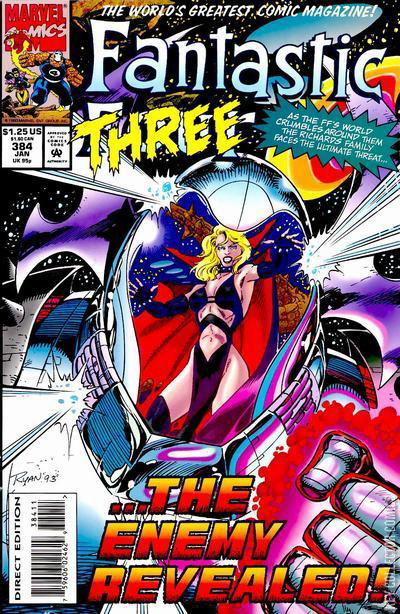 "My Enemy, My Son!" The Fantastic Four have returned form the Skrull throneworld to Earth where the Thing finds that his ex-girlfriend Sharon Ventura has been stolen from the medical bay where she was kept in stasis after being mutated by Doctor Doom. Ben goes on a rampage in the lab until he is stopped by Johnny and Sue who remind him that with Reed either dead or missing, they do not have anyone with the expertise to repair anything. When Sue goes to review the security system to see if they have a recording of whoever stole Sharon, they find that the tape is blank. When Ben tells them that they need to get into some money in order to repair their headquarters, Sue tells them that they cannot borrow any money because the banks see them as a financial risk, but she is exploring other avenues. Sue tells them that she has enough surplus money to hire a temporary replacement for Reed. When Johnny hears Sue talking like Reed wasn't killed in Latveria, he tries to get her to come to terms with this reality, Sue snaps back, reminding them that they saw no body and it could all be a trick being played on them by Doom. The argument is cut short when Roberta calls up to inform the group that Reed's temporary replacement has arrived. Sue goes down to interview their would be applicant, telling Ben and Johnny to clear the place up while she is gone. While Ben and Johnny begin cleaning up, they start talking to about Reed, and Johnny asks why Ben never let Reed look at his face, Ben tells him that Reed wasn't a plastic surgeon and he figured it didn't make a difference if his face was scarred or not, a monster is a monster. When Johnny remarks that this isn't the Ben Grimm he remembers, Ben suggests that maybe after Reed the group could use some change. The conversation is interrupted again, this time by Sue arriving with the new applicant, scientist Scott Lang, who has been recommended to the group by Tony Stark. Lang introduces himself and tells Ben and Johnny how his daughter Cassie is a huge fan of the Fantastic Four. When Johnny offers to sign an autograph for Cassie, Ben becomes agitated and makes a sarcastic comment about sending Cassie a dumbbell bent into the shape of a heart before storming off. Sue tells Scott to ignore the outburst and takes him on a tour of the Four Freedoms Plaza. Johnny meanwhile directs his thoughts on the baby that his ex-wife Lyja is about to have. He enters her room just as Lyja is waking up from a horrible nightmare where she is being terrorized by Paibok, who murders Johnny. Lyja tells Johnny that there is something she must tell him, but asks her if she really wants to get into it right now, and Lyja decides against telling him, for now. At that moment above Grand Central Station, Franklin Richards watches the city move below him, remarking at the contrast of the wasteland New York has become in his future. The Richards youth is realizing that his grandfather Nathaniel Richards has been intended to send someone else into the past and stop the one responsible for the downfall of the Fantastic Four. Believing that this person is his own mother, Franklin dawns his Psi-Lord armor and heads toward the Four Freedoms Plaza intent on carrying out his mission, regardless of the truth. Meanwhile, Sue has taken Scott Lang into Reed's Time/Space Laboratory, where Lang is blown away by the technology found there. She explains that his primary job will be to search the data on Doctor Doom's memory module for any trace that indicates that Doom used his matter transferal device to abscond with Reed as some sort of trick to convince the Fantastic Four that both he and Reed perished during their last battle. While outside at a nearby news stand, Ben gets a newspaper and is shocked by a report that Doctor Doom may have resurfaced in Latveria. He decides that he has also been putting off checking in on Alicia Masters and becomes determined to look in on her. Before Ben can go on, he is bumped into by some children buying X-Men comics, who are frightened when they see Ben's scarred face and go running. As Ben processes this, he sees a beam of light head towards the Four Freedoms Plaza and suspects trouble. Ben's right, as Sue and Scott's interview is interrupted the the arrival of Psi-Lord who vows to destroy Sue. Always suspecting that this teenaged Franklin Richards was an impostor, Sue fights back. As the two fight it out, Sue uses her powers to pull Scott out of the room and seals the door so Franklin cannot harm anyone else. As the battle continues, Ben, Johnny and Lyja join Scott outside and try to break through the door, but to no avail. When all their powers fail to break through, Scott offers his assistance, opening his gym bag he pulls out the helmet belonging to Ant-Man. While inside the lab, Franklin and Sue are at a stalemate, so Franklin decides to change tactics. Dropping his Psi-Lord armor, Franklin gets his mother's guard down by talking to her. When she is sufficiently distracted, he enters her mind with his psi-powers. Inside Sue's mind, Franklin finds that Malice has taken full control of her personality again. Revealing herself to Franklin, Malice lashes out at the boy, intent to destroy him. As that battle of the minds rages, Scott Lang reveals to his new potential employers that he is really Ant-Man. Putting on his costume and shrinking down to size, Ant-Man then enters the lock on the door in order to pick it from inside. While inside Sue's mind, the battle between Franklin and Malice continues. When Franklin appears to gain the upper hand, Malice surprises him by catchin him in a mental probe. While outside, Ant-Man manages to pry the lock open, allowing the others to open the door. They arrive in on Franklin -- now possessed by Malice himself -- standing over the unconscious body of Sue. The possessed Psi-Lord then blasts the rest of the Fantastic Four away, engages his Psi-Lord armor, and flies away. When Sue revives, Johnny tries to apologize for not be