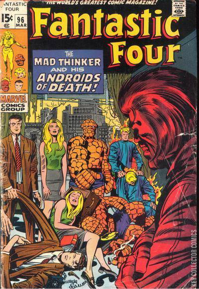 THE MAD THINKER AND HIS ANDROIDS OF DEATH! Once again trying to gain control of the Baxter Building, the Mad Thinker has created android duplicates of the Fantastic Four who are sent out to attack and capture the other members of the group. While Ben is knocked out at the Baxter Building itself, Johnny and Sue are subdued and replaced by their android counterparts in public. When Reed is attacked by the android version of himself, he manages to defeat it and pose as it, enabling Reed to get back into the Baxter building and free Ben. The two heroes then bust up the Thinker's androids and capture the Thinker himself. After turning the Thinker over to the police, Reed and Ben locate the sedated Sue and Johnny at the Thinker's hideout and revive them.