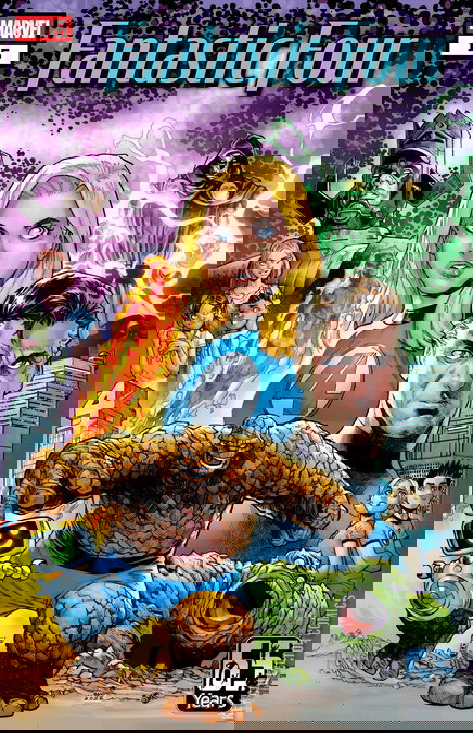 It's the 65th anniversary of The Fantastic Four, and to celebrate, we've got an extra-large, extra-fantastic adventure for you starring everyone's favorite adventurers, spanning centuries of history and a universe of scientific progress! The Fantastic Four have been defeated: with their personal arrows of time reversed, they're careening into the past with no hope of salvation - unless a complete stranger can find out what they need. But even if she does, that will only get them halfway home, because there's still a threat in the present that's waiting to kill them - and that's IF they can arrive there alive! This is one issue you won't want to miss - because you'll have to wait 65 years for ANYTHING like it. PLUS: Johnny's mustache saves New York City?!