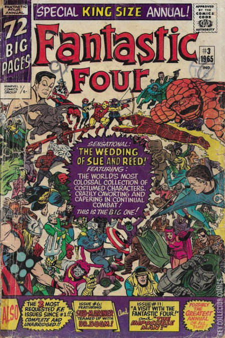 Reading the news of Reed Richards and Susan Storm's wedding day, Dr. Doom plots to ruin it by using his emotion changing device to make the super-villain community (whether or not they are a foe of the Fantastic Four) attack their wedding service. There is a crown gathered outside to observe those coming and going from the wedding. The crowd includes both Mille the Model and Patsy Walker. Nick Fury and S.H.I.E.L.D. provide security for the wedding and stop a guest whom the Puppet Master is controlling from poisoning Thing. While Thing considers telling Reed about the incident, Mole Man and his Moloids attack from underneath the building. Professor X summons the X-Men to help Thing ward them off. Reed, Sue and Johnny are attacked by the Red Ghost and his Super-Apes, until they are banished to another dimension by the arriving Dr. Strange. With the initial attacks blunted, Dr. Doom increases the power enticing villains such as the Mandarin, Black Knight, Kang, the Awesome Android, and the Grey Gargoyle to attack. While on his way to the wedding, Thor is attacked by the Super-Skrull who is defeated by the Thunder God with the help of the Human Torch. Daredevil spots Hydra agents trying to drive a missile into the wedding party and succeeds in driving it away. He dumps it in New York harbor where the missile detonates stopping an attack by the forces of Attuma the Barbarian. The arriving Avengers, Captain America and Hawkeye fight Cobra, Executioner, Enchantress, Mr. Hyde and the Mad Thinker with the help of Spider-Man. While Daredevil is chased by the Black Knight, an assist by the X-Men is interrupted by the arrival of the Mandarin, Electro, Unicorn, the Melter and the Beetle, while Quicksilver battles the Human Top. Soon things explode into an all out battle between the heroes and villains until Reed Richards is then summoned to the Watcher's citadel, where he is given a device that will allow him to send all his attackers away with no memory of what transpired. With the villains defeated, Reed and Sue are married off, while outside Stan Lee and Jack Kirby are asked to leave the ceremony as they do not have invitations. Quoted from Marvel Wikia