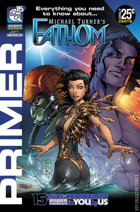 Celebrate Aspen's 15 Year Anniversary with 25-cent Primer issues! New readers and fans alike can find everything they need to know about Aspen's flagship title in this new Michael Turner's Fathom 15 Year Anniversary Primer issue! Journey under the surface with Aspen Matthews and the awe-inspiring world of The Blue once again, and check out never-before-seen commentary, art and creator secrets in anticipation of Volume 7 and more?All for only a quarter! These Aspen Anniversary edition primer issues are the perfect compliment to discover more about Aspen's upcoming slate of new and returning titles!