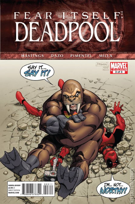 Fear Itself Tie-In - Memo to Deadpool: next time you gussy up a loser villain so you can beat him easily and scam people out of their hard earned money, make sure you don't accidentally actually make him more powerful than you. Of course, that assumes you'll be willing to show your face after getting beaten by the now-unstoppable-but-still-incredibly-lame Walrus. Deadpool puts the hammer down and drives home the most irreverent tie-in of the year!